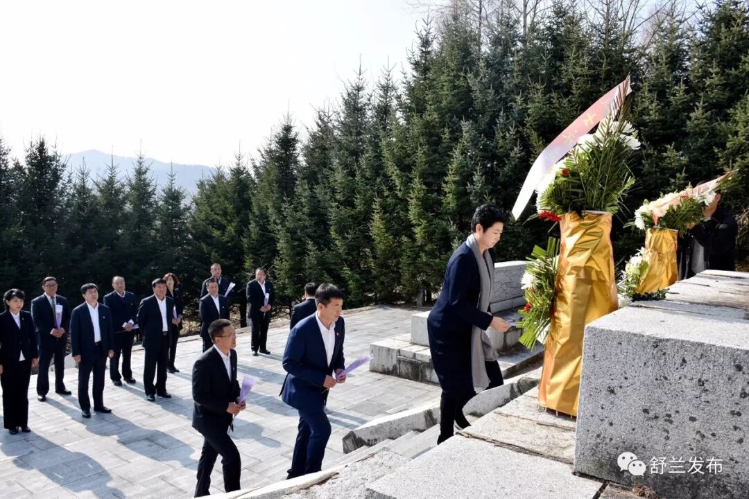 上午,市委书记李鹏飞、市人大常委会主任杨文坦、市长金华等18位副市级以上党员领导干部走进全国重点文物保护单位、国家级抗战遗址、吉林省爱国主义教育基地——舒兰市老黑沟惨案遗址,回顾舒兰抗战历史,悼念老黑沟惨案遇难同胞。