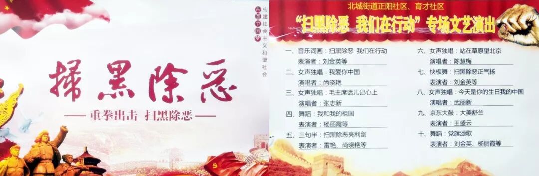 正阳、育才社区艺术团带来了丰富多彩的节目,有群众喜闻乐见的三句半《扫黑除恶亮利剑》,以通俗易懂的形式宣传扫黑除恶专项斗争,进一步提高群众对扫黑除恶专项斗争的认知;有女声独唱《我爱你中国》,以美声唱腔抒发着对祖国的深情厚意;有诙谐易懂的京东大鼓《大美舒兰》,以其独特的形式,讲述着舒兰人民生活的变化与扫黑除恶的决心... …